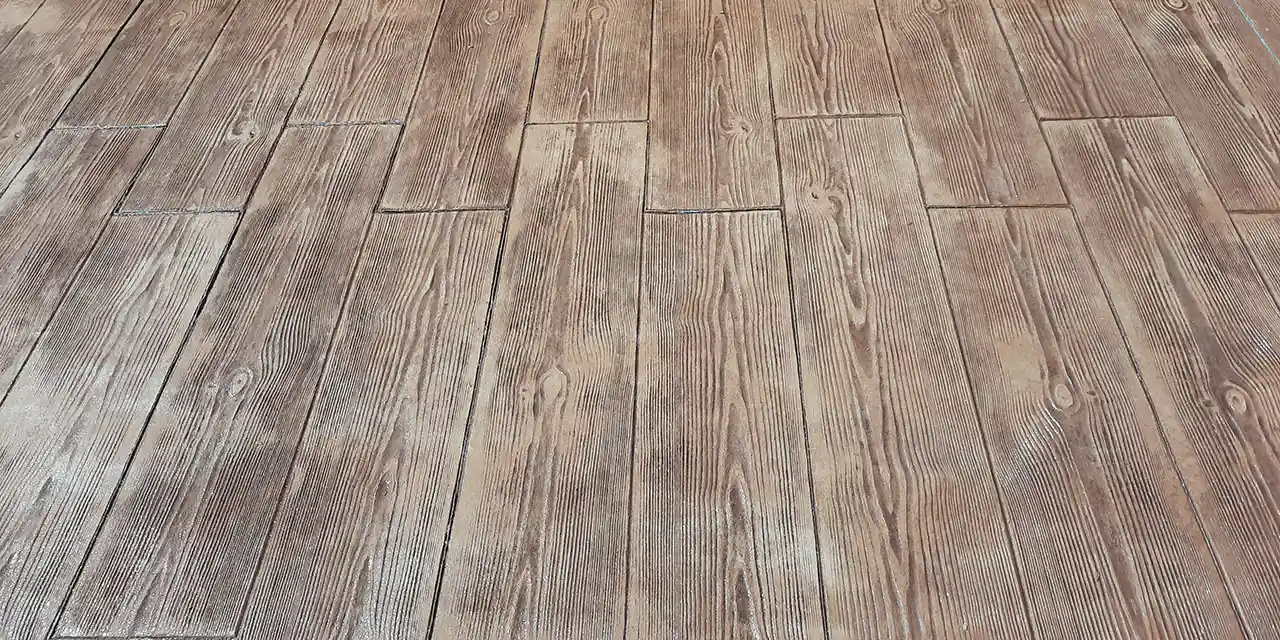 Obra de hormigón impreso realizada en la provincia de Guadalajara, con un estampado de moldes imitación la madera en color corcho y vetas en nogal..