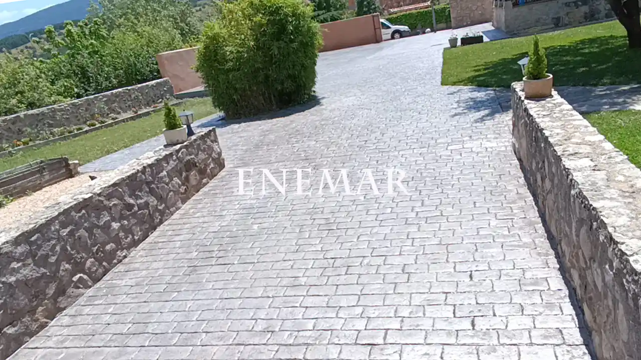Instalación y mantenimiento de hormigón impreso en Segovia ( Pradena ), obra realizada con empresa Enemar. Pavimento impreso entrada de la casa, acabado con moldes adoquín rustíco, color gris plata y pizarra.